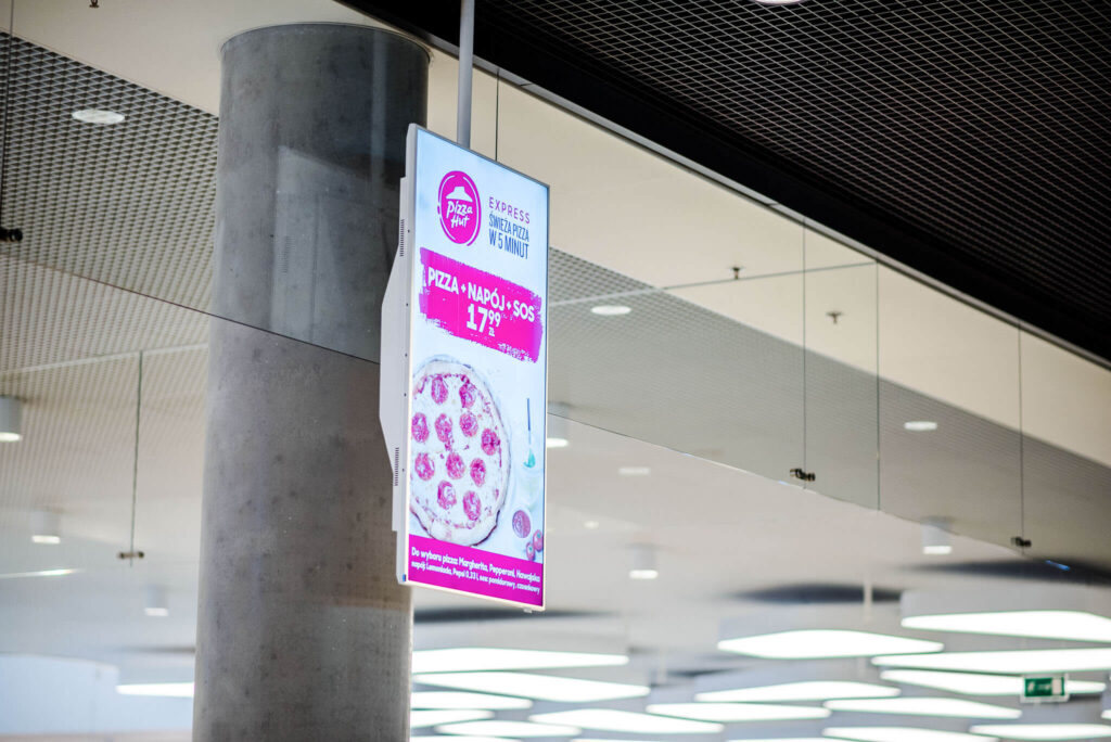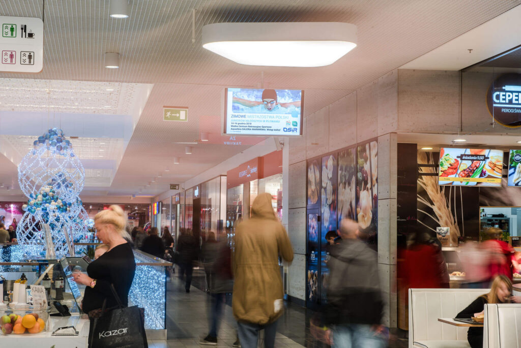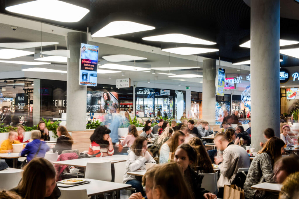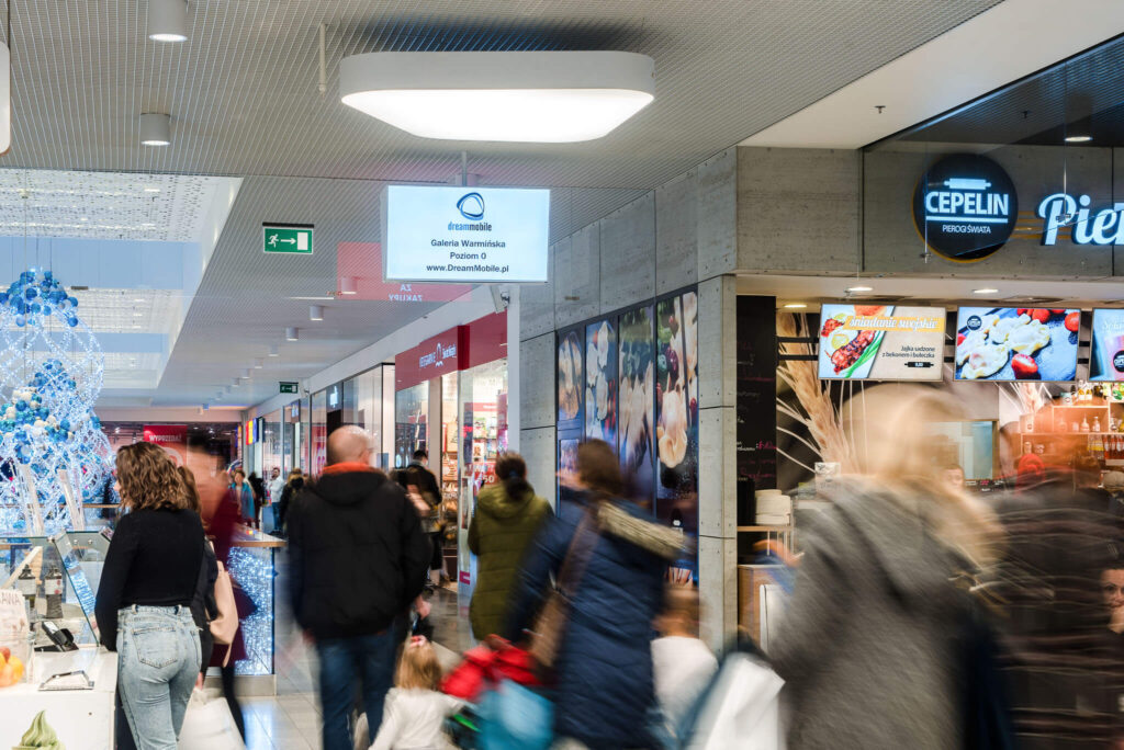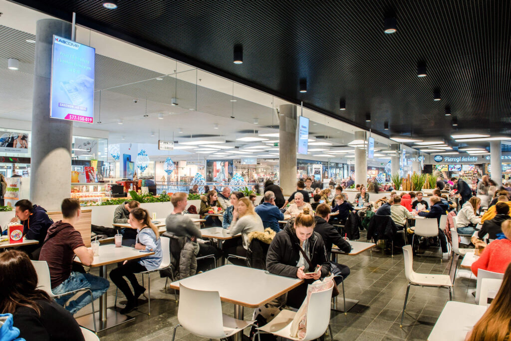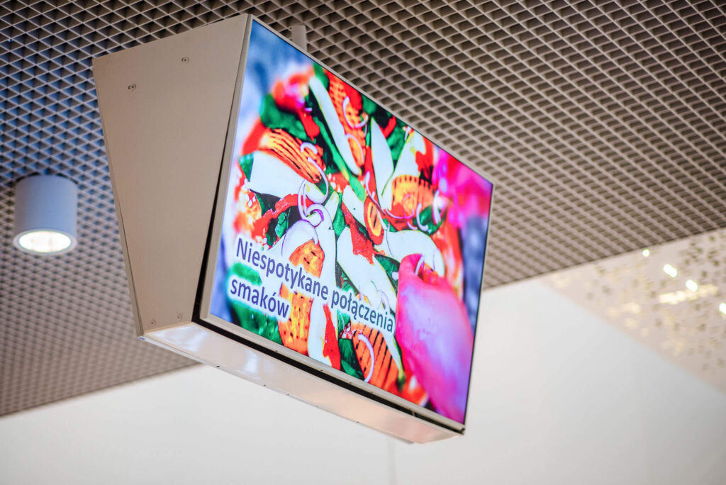 Nasze ekrany w galerii warmińskiej w Olsztynie są także zlokalizowane w samym centrum galerii w strefie Food Court, gdzie przebywa jednocześnie najwięcej klientów. Umiejscowienie ekranów w strefie Food Court generuje najwięcej interakcji klienta z przekazem reklamowym ze względu na największe skupienie klientów w strefie gastronomicznej.
