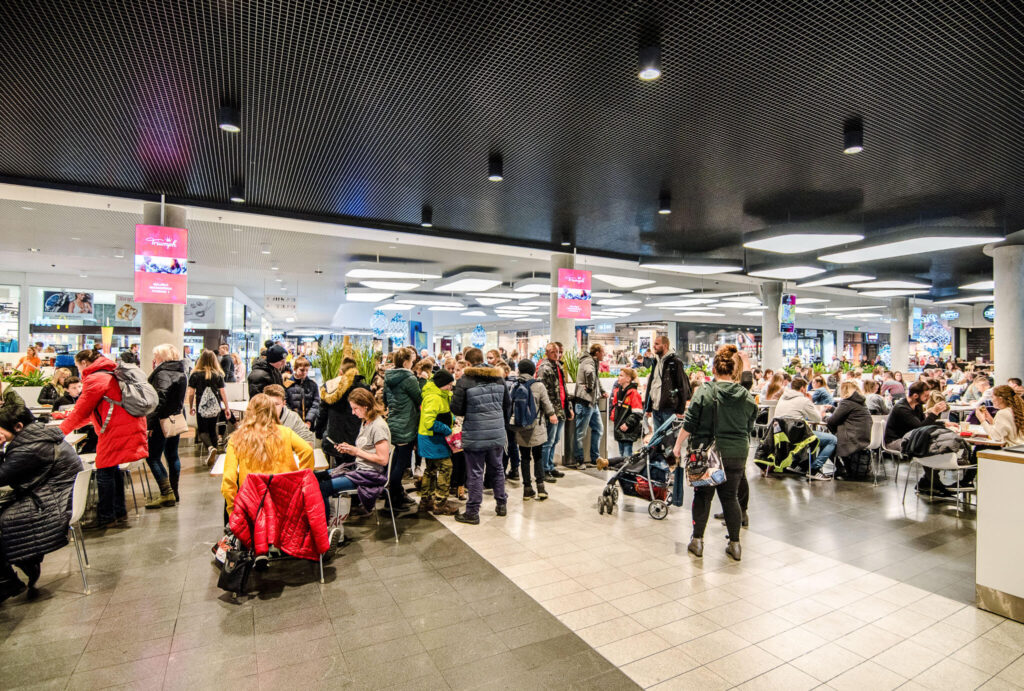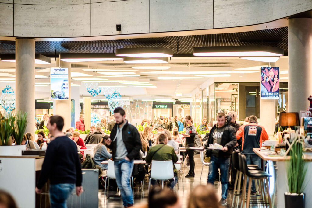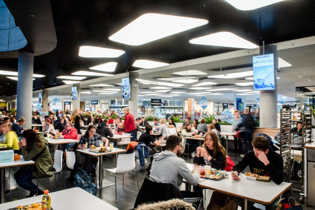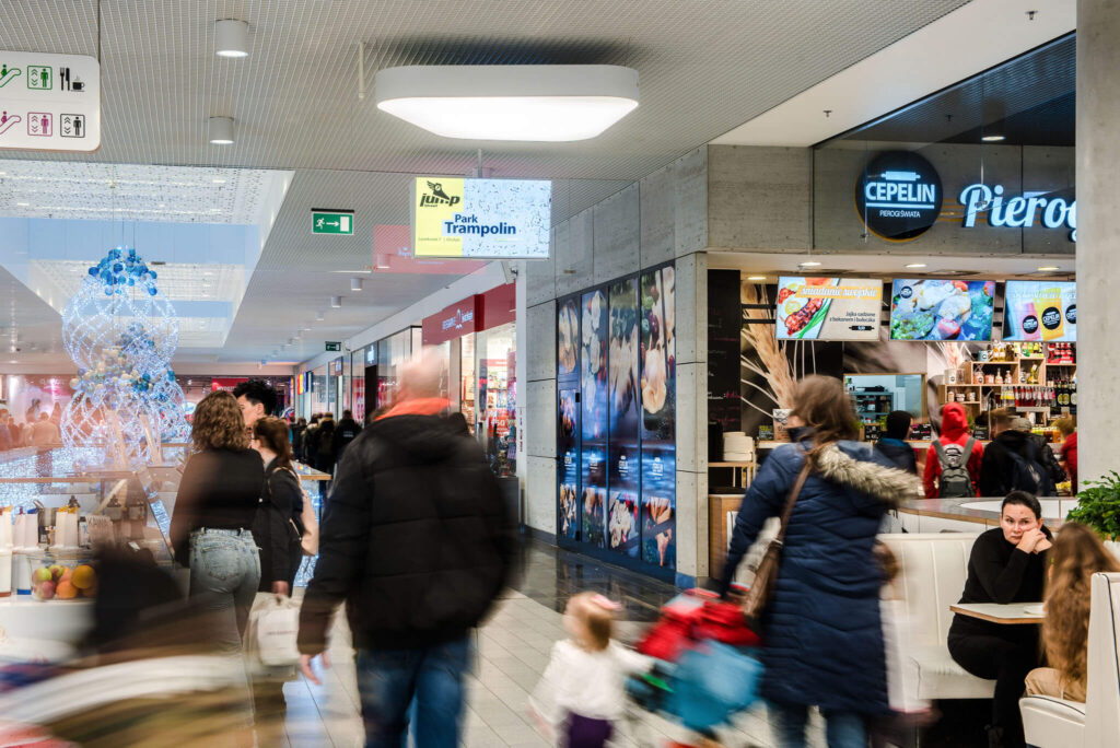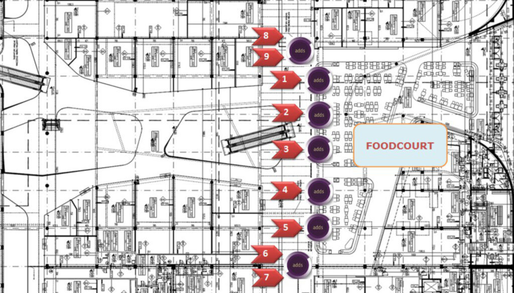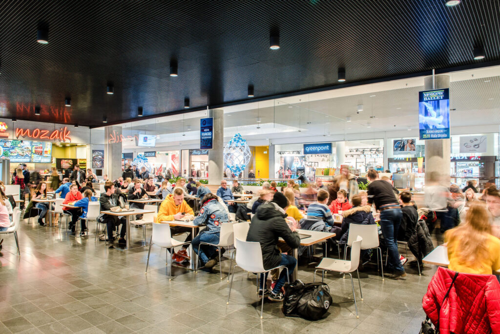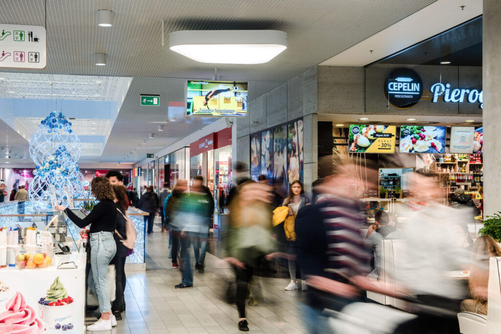 Nasze ekrany w galerii warmińskiej w Olsztynie są także zlokalizowane w samym centrum galerii w strefie Food Court, gdzie przebywa jednocześnie najwięcej klientów. Umiejscowienie ekranów w strefie Food Court generuje najwięcej interakcji klienta z przekazem reklamowym ze względu na największe skupienie klientów w strefie gastronomicznej.