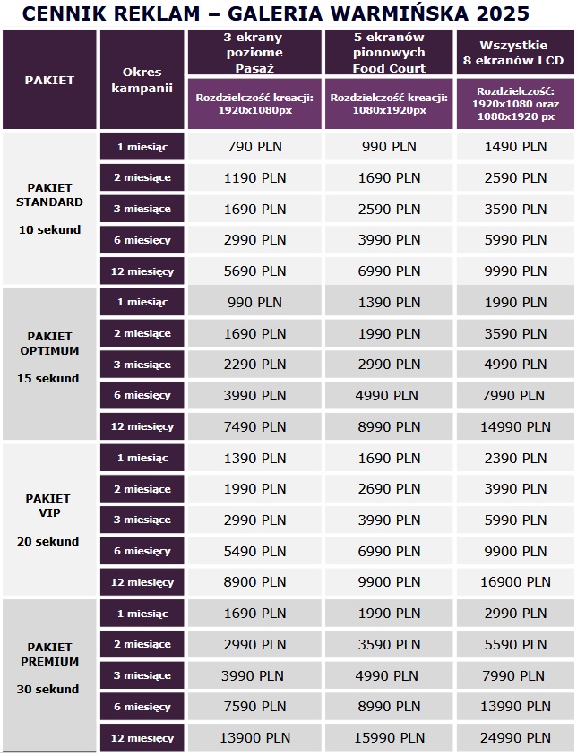 Chcesz dotrzeć do swoich klientów tam, gdzie podejmują swoje decyzje zakupowe i spędzają wolny czas? Odpowiedzią jest reklama na ekranach LCD w galerii warmińskiej w Olsztynie. Codziennie galerię warmińską odwiedza ogromna liczba osób (700 000 osób miesięcznie), które mogą stać się Twoimi potencjalnymi klientami.